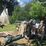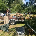 Es gibt viel zu tun – packen wir’s an! Unter diesem Motto entschieden sich die ambitionierten Ehrenamtlichen zwischen verschiedenen Arbeitsgruppen. Werkzeug und Gerätschaften waren reichlich vor Ort. Unter Anleitung des „Häuptlings“ Olly Fritsch, dem Chef der Naturindianer und seinem Team, kümmerten sich vier Kleinteams um so schweißtreibende Arbeiten wie Entbuschen und Aufräumen des Geländes, Entsorgen des Sperrmülls und Decken des Unterstandes mit neuer Dachpappe. Zwischendrin stärkten sich die fleißigen HelferInnen mit einem leckeren Gemüseeintopf und Schokoladencreme.