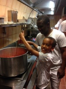 Um ein nachhaltiges Bewusstsein dafür zu schaffen, dass es vielen Menschen nicht so gut geht wie uns in unseren privilegierten Lebensverhältnissen, arbeitete Lehrer Eric Gladhart über ein Jahr lang mit seiner dritten Klasse zum Thema Flucht und Migration, Heimat und Vertreibung. Die Kinder setzten sich mit ihren Ansichten, Vermutungen und Vorstellungen über geflüchtete Menschen auseinander und protokollierten sie in Aufzeichnungen und Bildern. Sie näherten sich dem Thema Heimat über die Geschmacksrichtungen süß, sauer, salzig, bitter und „umami“. Hat nicht jede(r) ein Lieblingsessen, dessen Duft und Geschmack mit einem Gefühl von Geborgenheit, Zuhausesein und Entspannung verbunden sind? Nachdem die Idee entwickelt war, eine Begegnung mit Bewohner*innen einer benachbarten Unterkunft für Geflüchtete zu initiieren, wurden Rezepte gesammelt um gemeinsam zu kochen und auf diese Weise ins Gespräch zu kommen.
