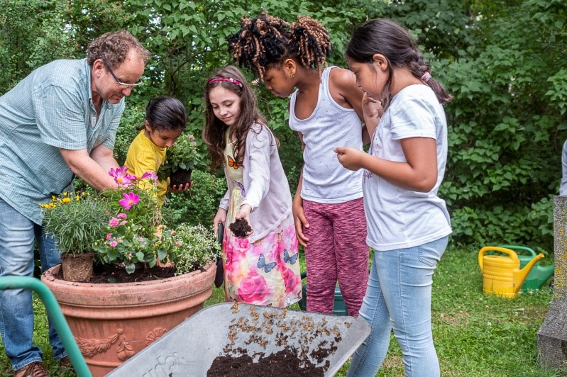Eine ganz besondere Kooperation entstand mit dem Städtischen Friedhofsamt: die Kinder durften in Zusammenarbeit mit Landschaftsarchitektin Kristin Englerth und Gärtnermeister Uwe Gebhardt im Sommer zwei große Blumenkübel im Eingangsbereich bepflanzen und im Herbst Blumenzwiebeln stecken, um den Bereich um die Aussegnungshalle mit Frühlingsblühern zu gestalten. Für das kommende Jahr ist ein Staudensaum geplant: so entsteht eine nachhaltige Blühpatenschaft für Bienenweide auf dem Friedhofsgelände in Haidhausen. Die Klasse hat durch ihr Projekt viel Resonanz bekommen und schon neue Engagementideen.