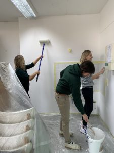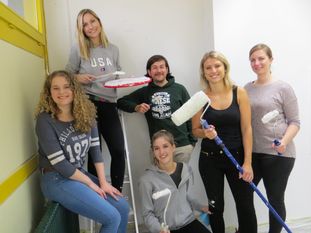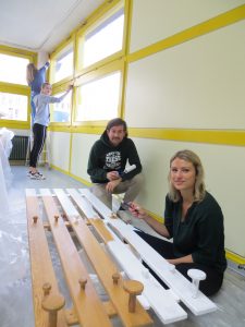 Es wurden Vorhangstangen geputzt, Fußleisten und Steckdosen abgeklebt und Möbel abgedeckt und alle waren mit Feuereifer bei der Sache. Mit der passenden Musik und viel Spaß gingen schließlich auch die Streicharbeiten und das Lackieren der Garderobe leicht von der Hand.