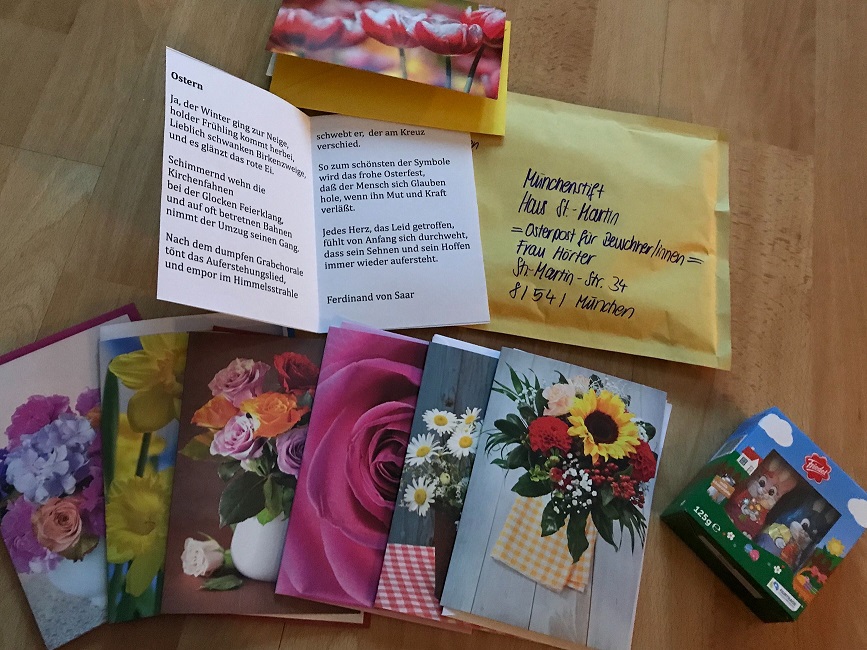 „… Gerade sprachen wir drüber, dass ich „meiner Seniorin“, Frau Mühlbauer ein Osterpäckchen schicken möchte und meine Schwester meinte, ich müsse das Päckchen aber unbedingt am Montag noch abschicken damit es noch rechtzeitig ankommt. Nach meinem Telefonat habe ich meinen Laptop hochgefahren und fand Ihre Email vor, die auch genau dieses Thema betrifft. Wie schön, dass Die Gute Tat Stiftung in diesen doch schwierigen Zeiten auch solche Initiativen anregt.“