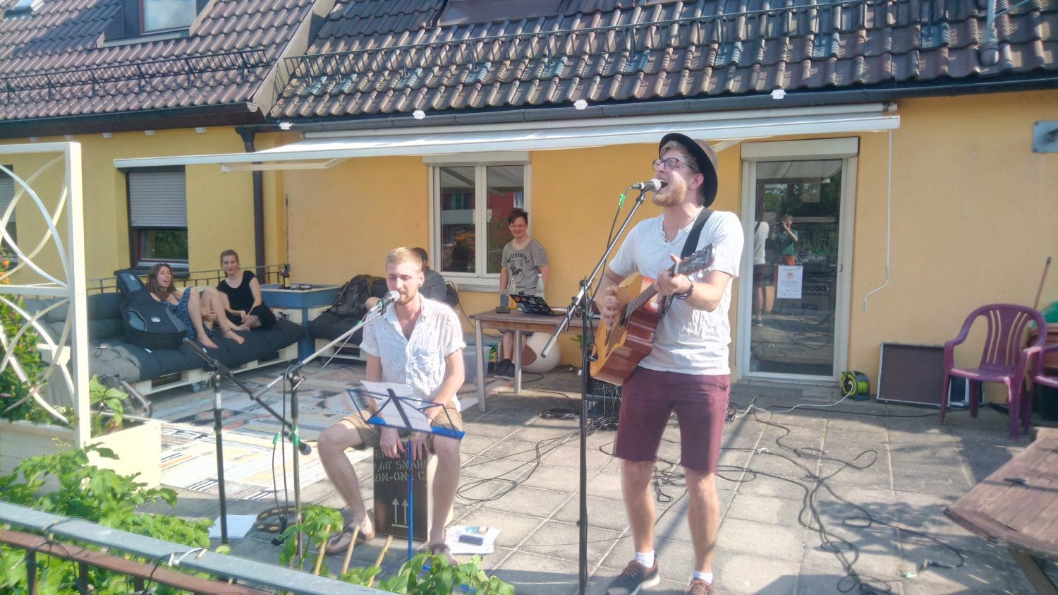 Am Freitag 26. Juni um 17 Uhr spielten Joschua Krink & friends Mitsingsongs, Balladen und akustischen Rock & Pop auf der lauschigen Dachterrasse in der Dientzenhoferstr. 68 – ein voller Erfolg bei Groß & Klein, so dass die Einrichtungsleitung Uschi Weber die Band hoffentlich zu einer Wiederholung des Konzerts einlädt!