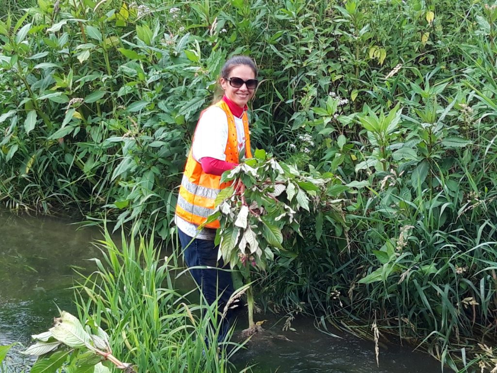 Es wurden Gruppen gebildet, die für verschiedene Bereiche zuständig waren und schon begannen am Gewässerrand erste Haufen mit entferntem Springkraut zu wachsen. Die Mitarbeiter*innen von Sky zeigten vollen Einsatz, trotzten der immer stärker werdenden Sonne, den Brennnesseln, vor denen manchmal auch lange Kleidung keinen vollständigen Schutz bot, oder wateten vorsichtig am Rand des Baches entlang, um auch wirklich jedes Springkraut zu erwischen.