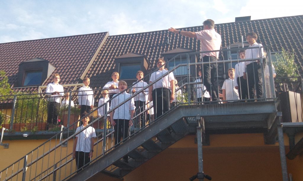 Es sah wirklich eindrucksvoll aus, wie sich die ca. 15 Jungen und ihr Chorleiter Ralf Ludewig auf der Dachterrasse und der Treppe formierten – ein wunderbares Seh- und Hörvergnügen! Das Publikum aus der Nachbarschaft nahm das Angebot dankbar an und belohnte den Chor mit herzlichem Applaus.