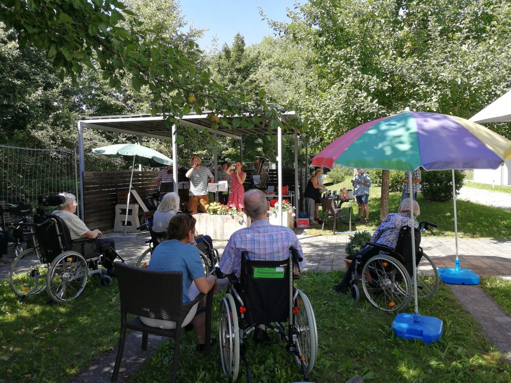 Da staunten die Bewohnerinnen und Bewohner des ASB-Seniorenzentrum Marie-Anne-Clauss in Fürstenried nicht schlecht, als immer mehr Musiker ihre großen Instrumente durch den Garten schleppten…