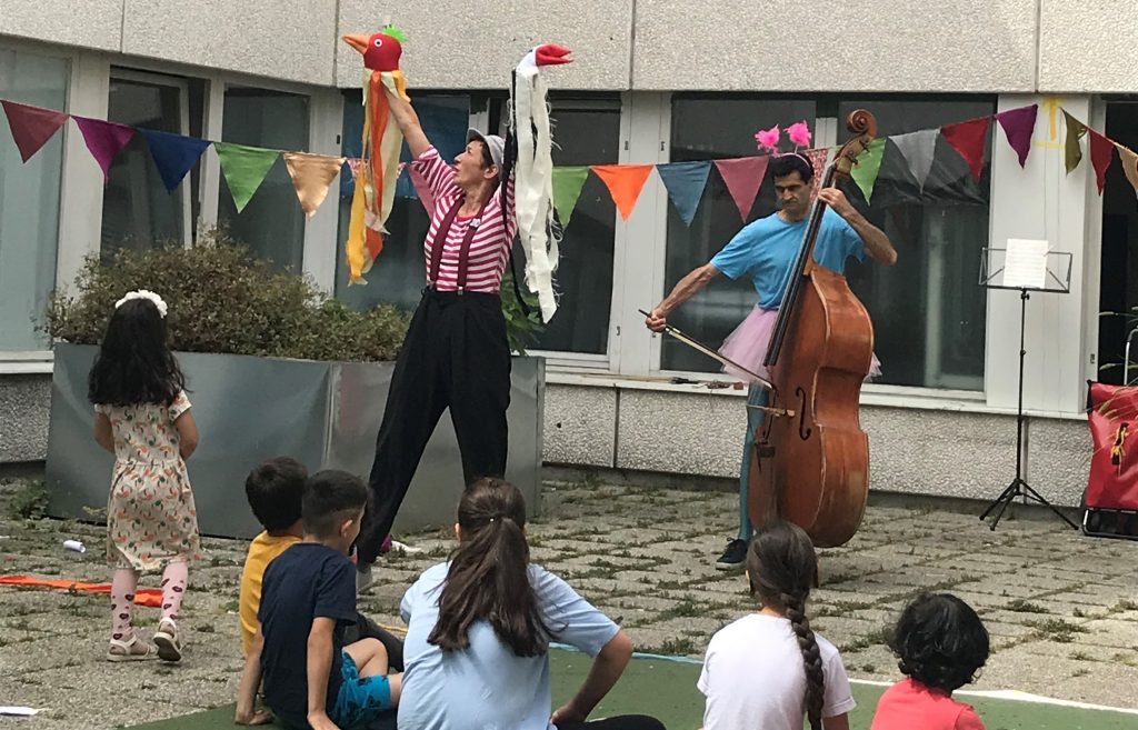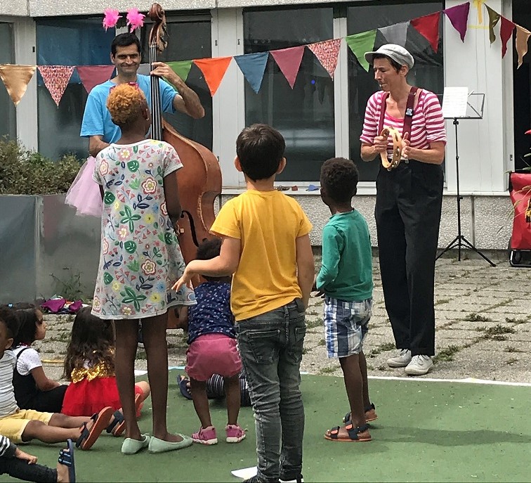 Mit Liedern und Musikstücken aus aller Welt und Bewegungs-Spielen motivierten sie die Kinder im Innenhof der Unterkunft zum kreativen Mitmachen. Eine junge Bewohnerin brachte ihre Musikwünsche ein und gemeinsam wurden sie mit Musik der ZIRKEL-Clowns untermalt.