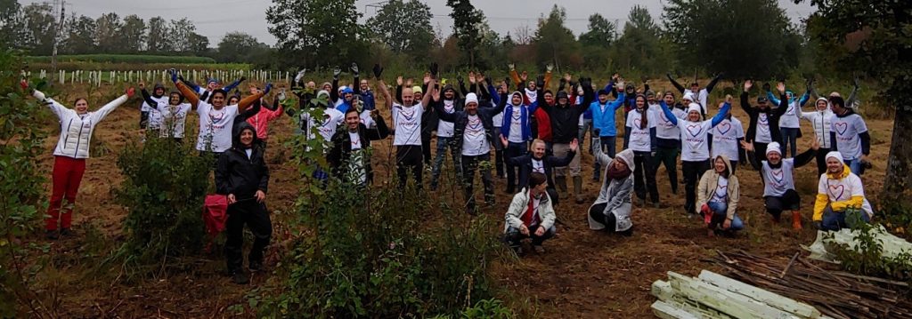 Das Sky-Team war, bis auf eine kleine Mittagspause, wo sich alle mit Sandwiches, Obst und süßen Teilchen stärken konnten, bis in den Nachmittag beschäftigt. Die körperlich anstrengende Arbeit gepaart mit dem regnerischen Wetter verlangte allen einiges ab. Dennoch war die Stimmung stets ausgelassen und alle engagierten sich mit viel Freude für die gute Sache. Die aufeinander abgestimmten Arbeitsschritte und hervorragend funktionierende Teamarbeit ermöglichten, dass am Ende dieses besonderen Arbeitstages alle stolz auf ihr Werk und die unzähligen Eichen-Reihen blicken konnten.