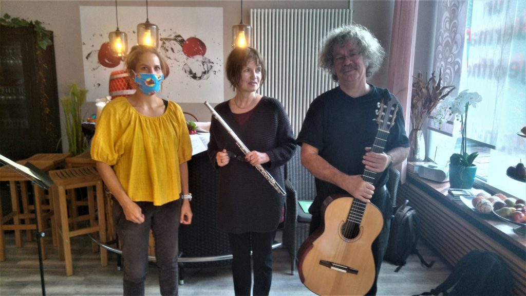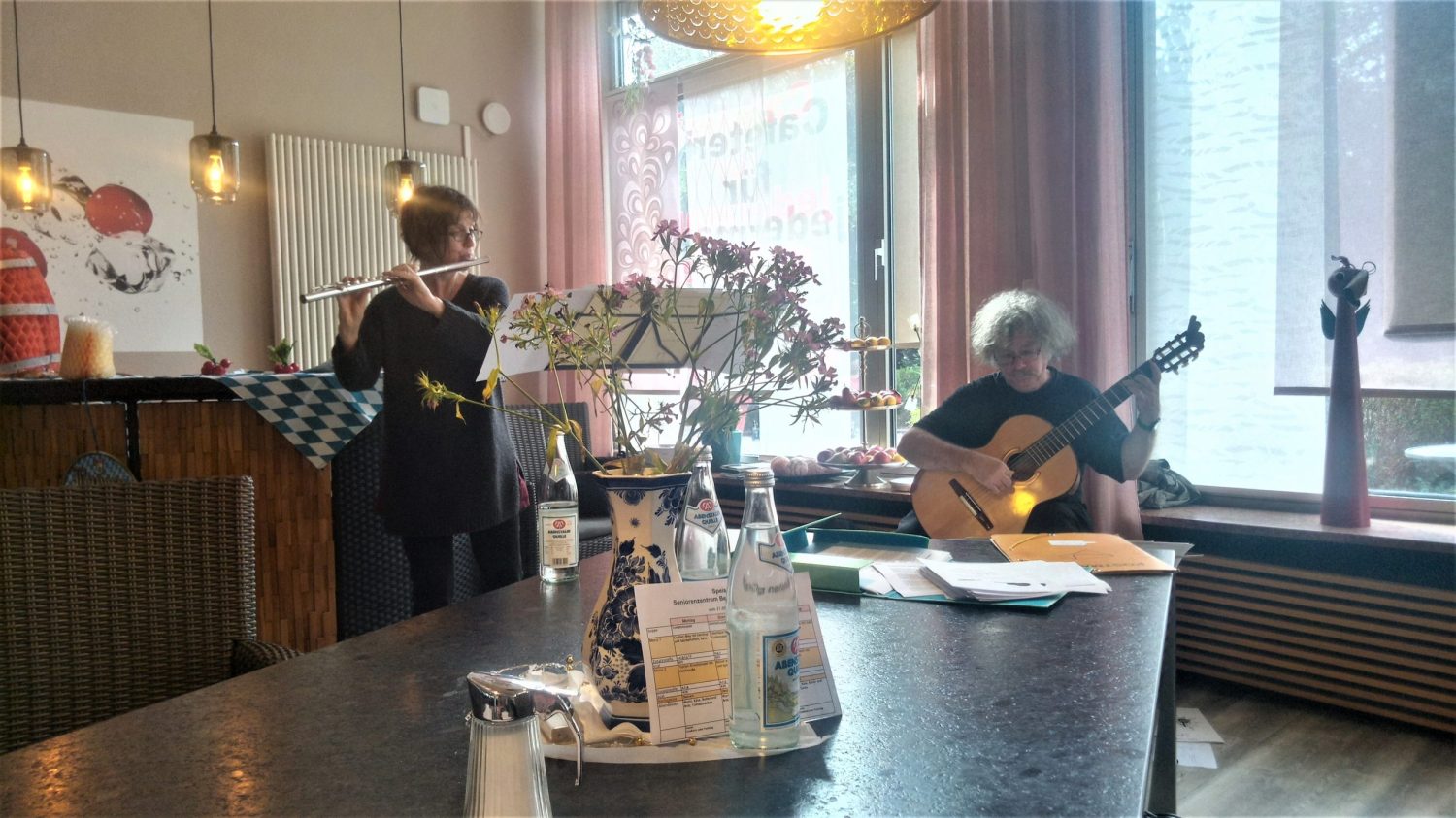 Die Literaturübersetzerin Sabine Hübner (Flöte) und der Chemiker Dr. Christian Ley (Gitarre) haben sich für diesen Anlass ein eigenes Programm ausgedacht: Abwechselnd wurden kleine Musikstücke aus Renaissance, Barock und 20. Jahrhundert mit Volksliedern zum Mitsingen kombiniert. Die Gäste nahmen das Angebot dankend an und summten oder sangen mit!
