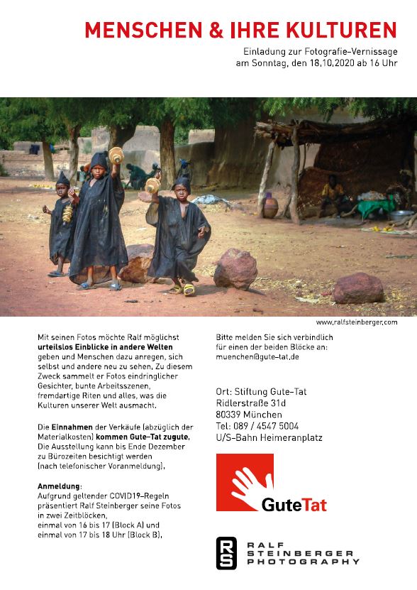Groß war die Freude aller Beteiligten, die Sonntag Nachmittag zur Ausstellung ″Menschen und ihre Kulturen″ des Fotografen Ralf Steinberger in die Räume der Stiftung Gute-Tat in die Ridlerstraße gekommen sind, denn es war viel Planung und Vorarbeit nötig, um ein Hygienekonzept auszuarbeiten, das den gegenwärtigen Anforderungen entspricht.