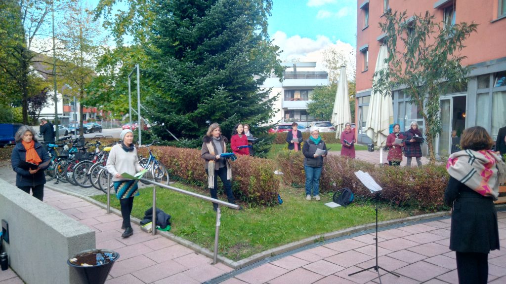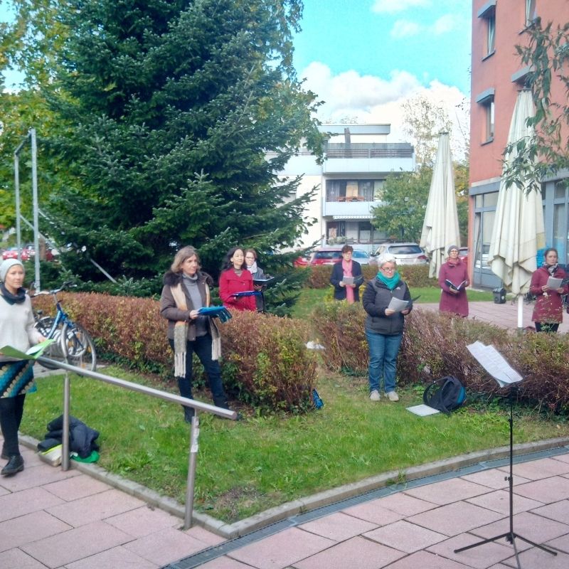 Gleich zwei Chöre sangen am letzten Sonntag vor dem Bethel Seniorenzentrum in Moosach und die Bewohner*innen lauschten auf ihren Balkonen und in den Zimmern.