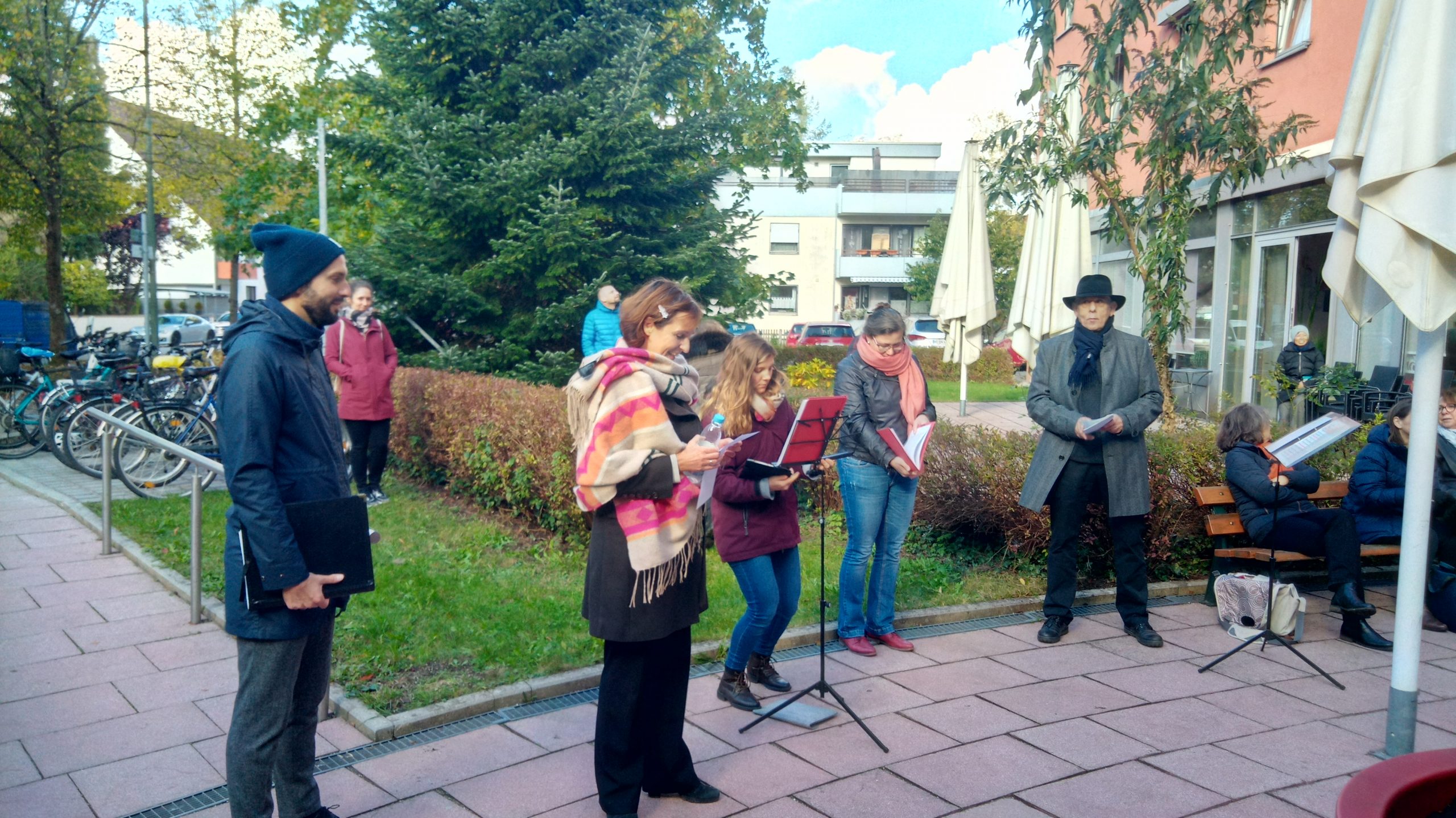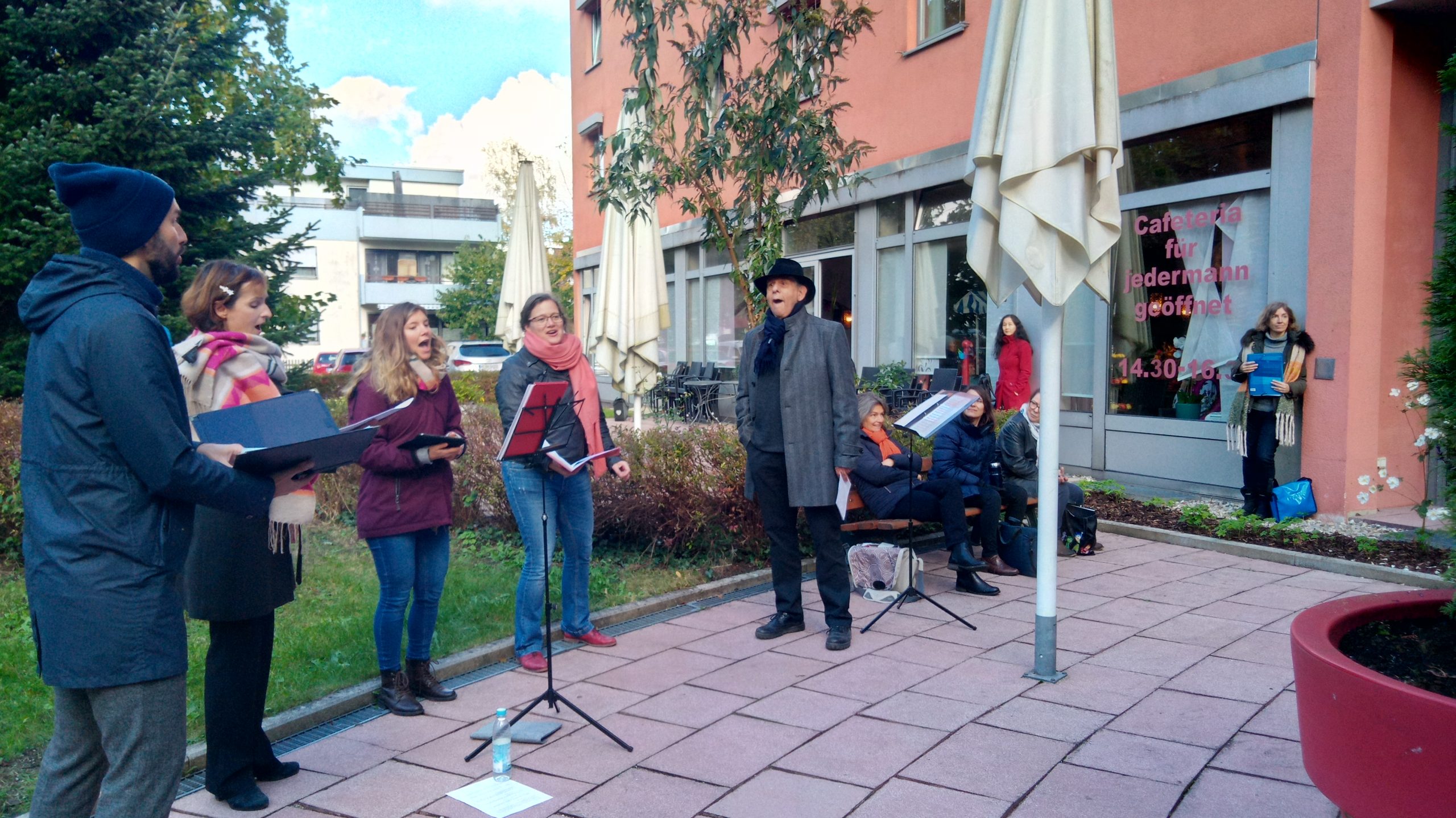 Gleich zwei Chöre sangen am letzten Sonntag vor dem Bethel Seniorenzentrum in Moosach und die Bewohner*innen lauschten auf ihren Balkonen und in den Zimmern.