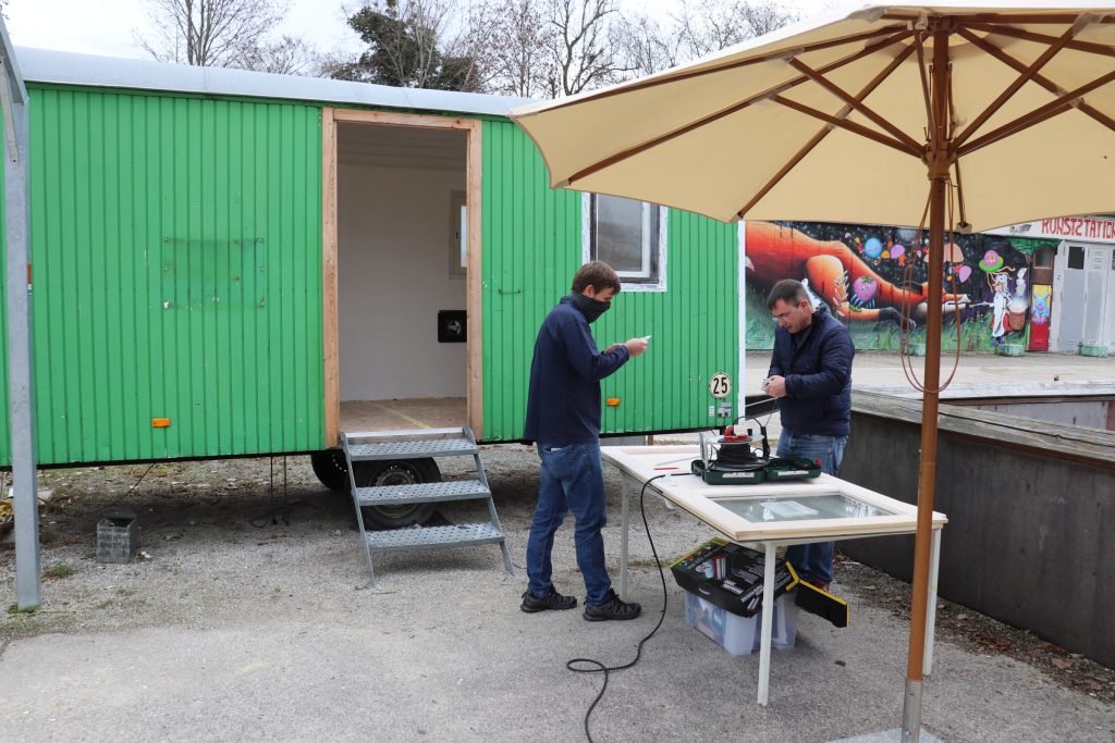 Die Mitarbeiter der IGEL AG tapezierten in einem ersten Schritt den Bauwagen und boten sofort an, für die weiteren Arbeiten erneut zu kommen.