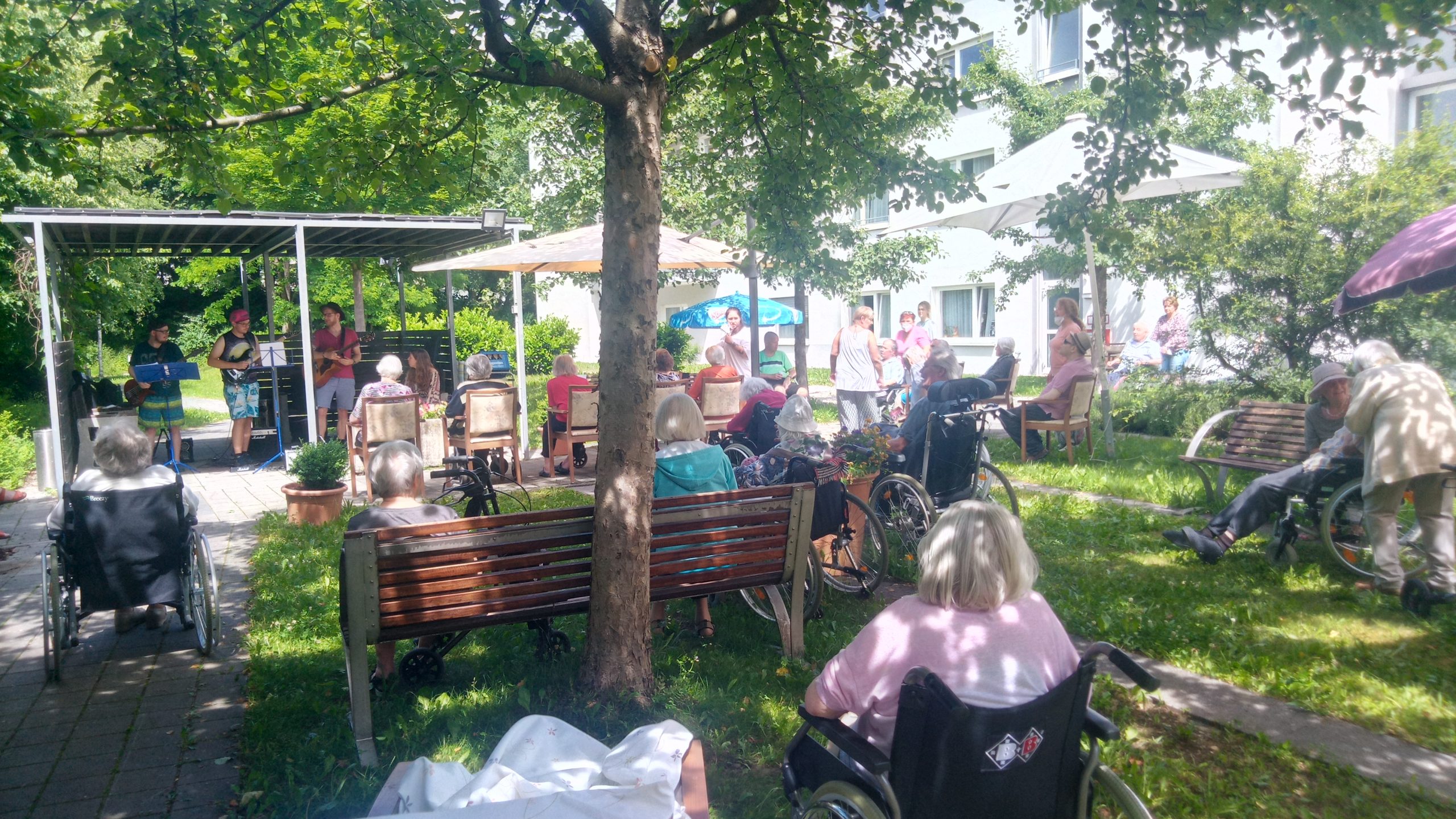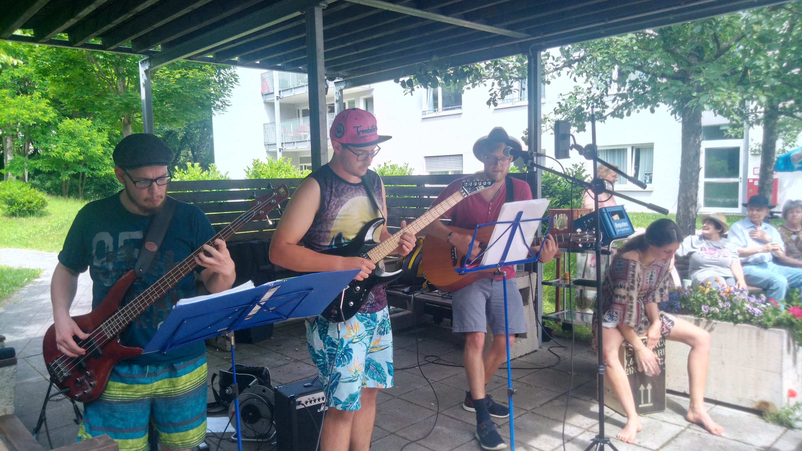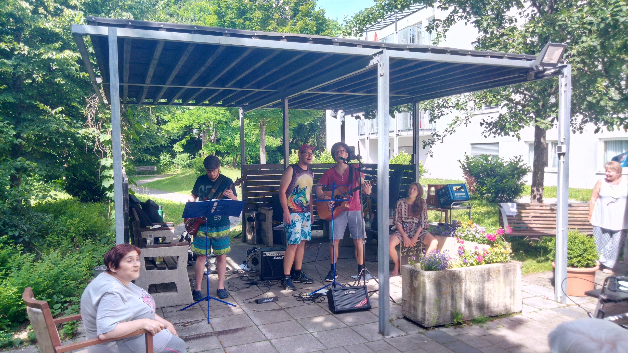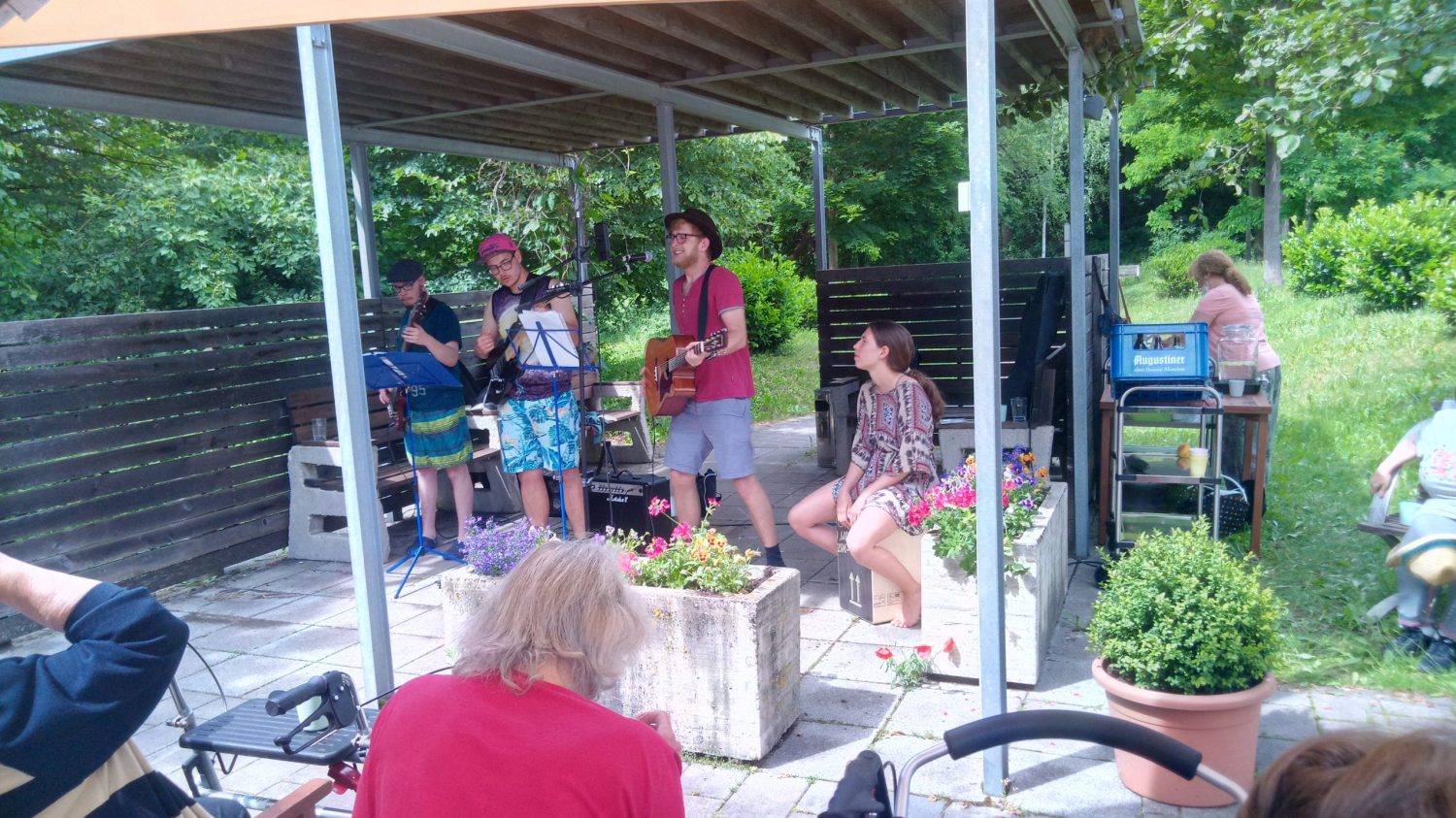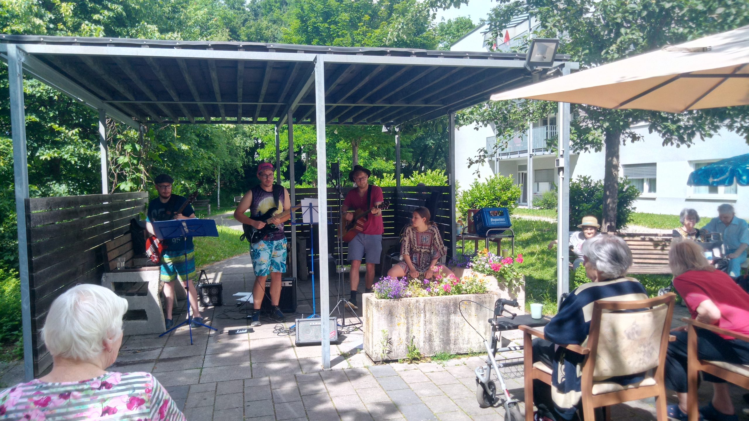 Diesmal war er mit Ole Berg (E-Bass), Severin Beger (E-Gitarre) und Hanna Hufnagel (Cajon) im lauschigen Garten des Arbeiter Samariter Bundes in Neuried. Bei schönstem Sommerwetter und super Bewirtung durch die Damen des Hauses machten die Vier auch dieses Mal riesigen Spaß mit ihren eingängigen Songs und steckten die Bewohner*innen mit ihrer guten Laune an!