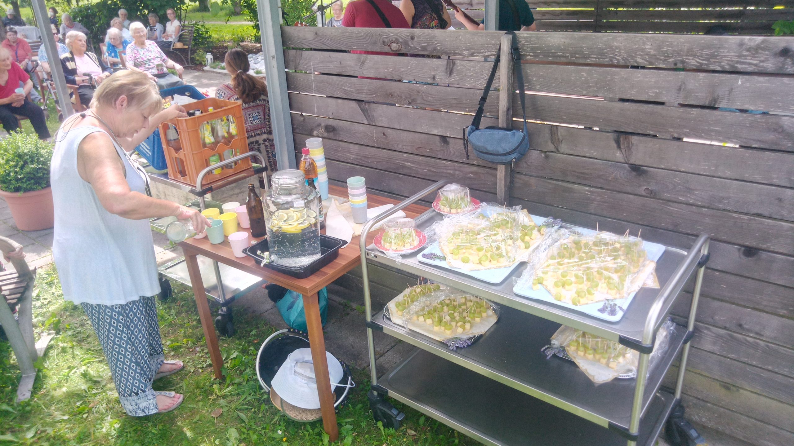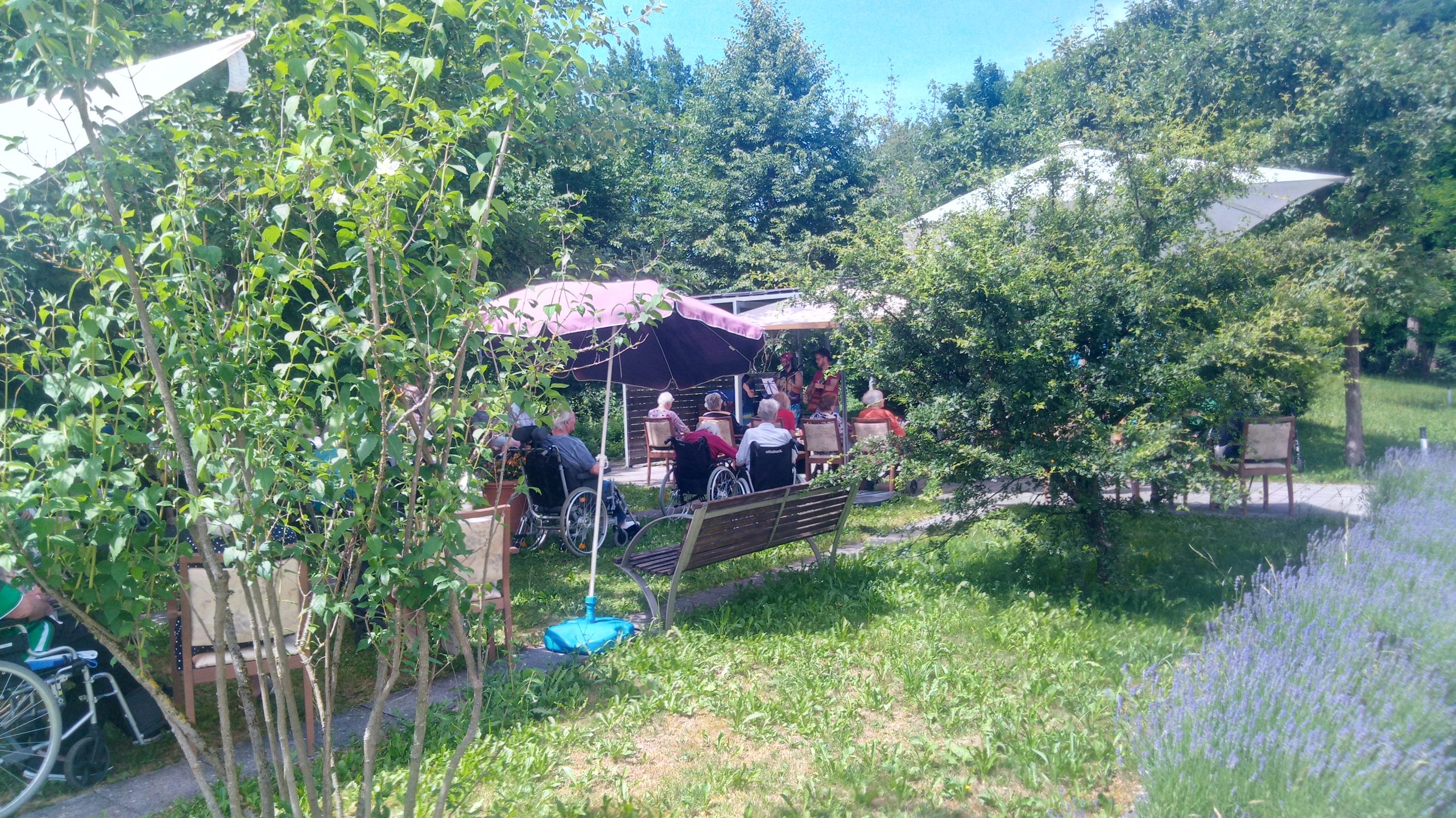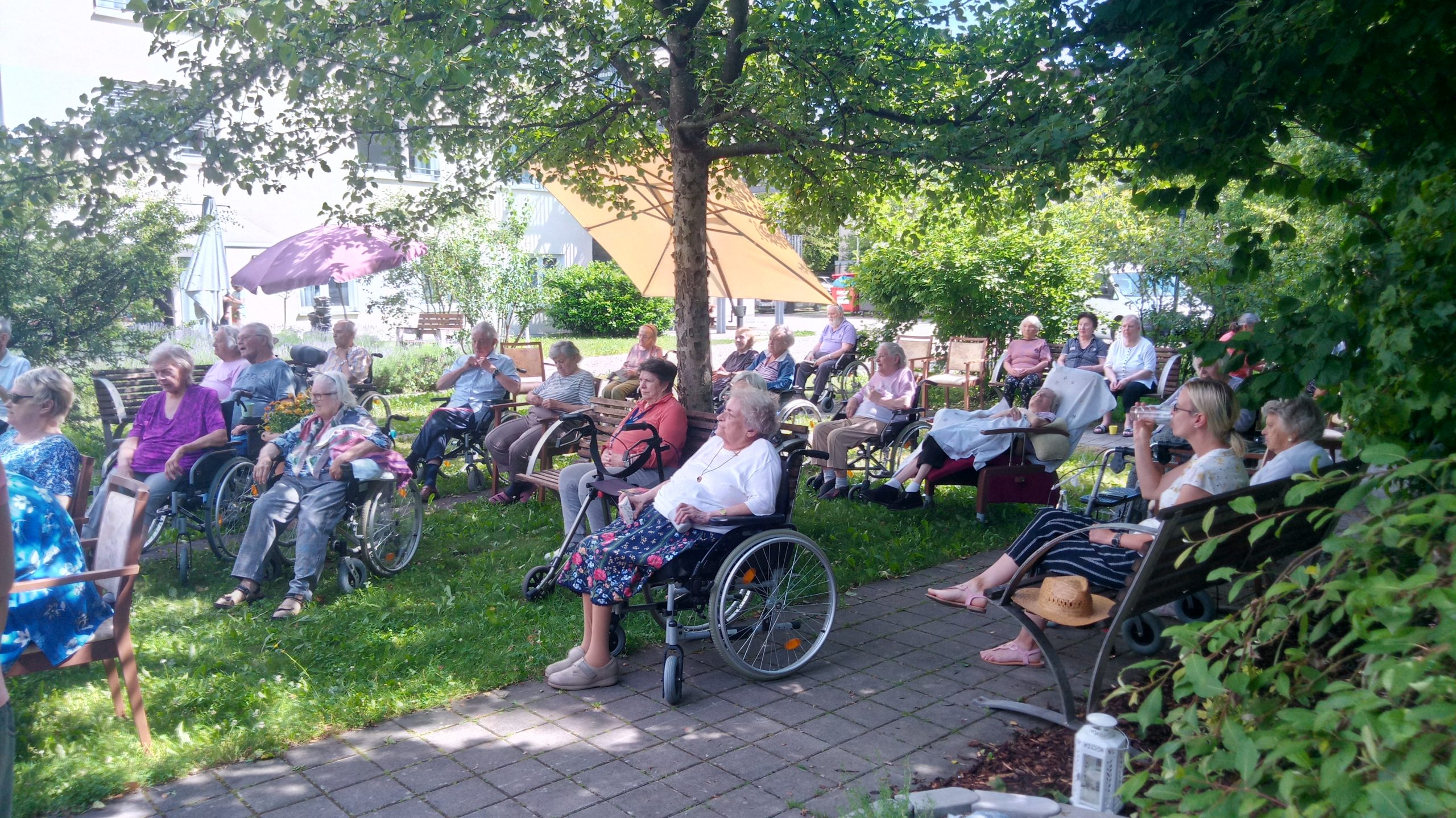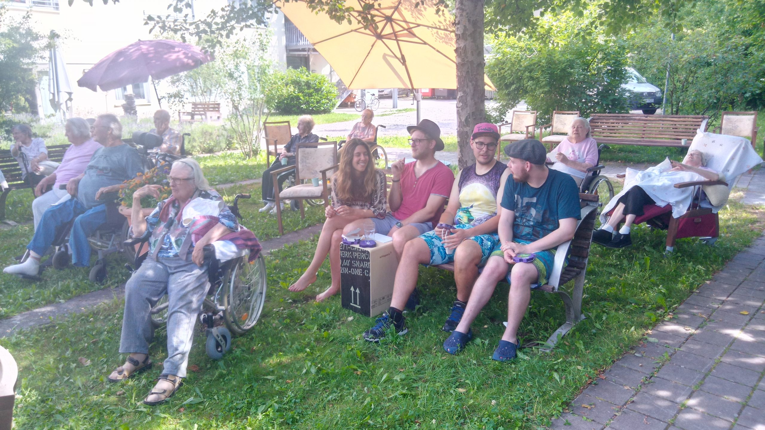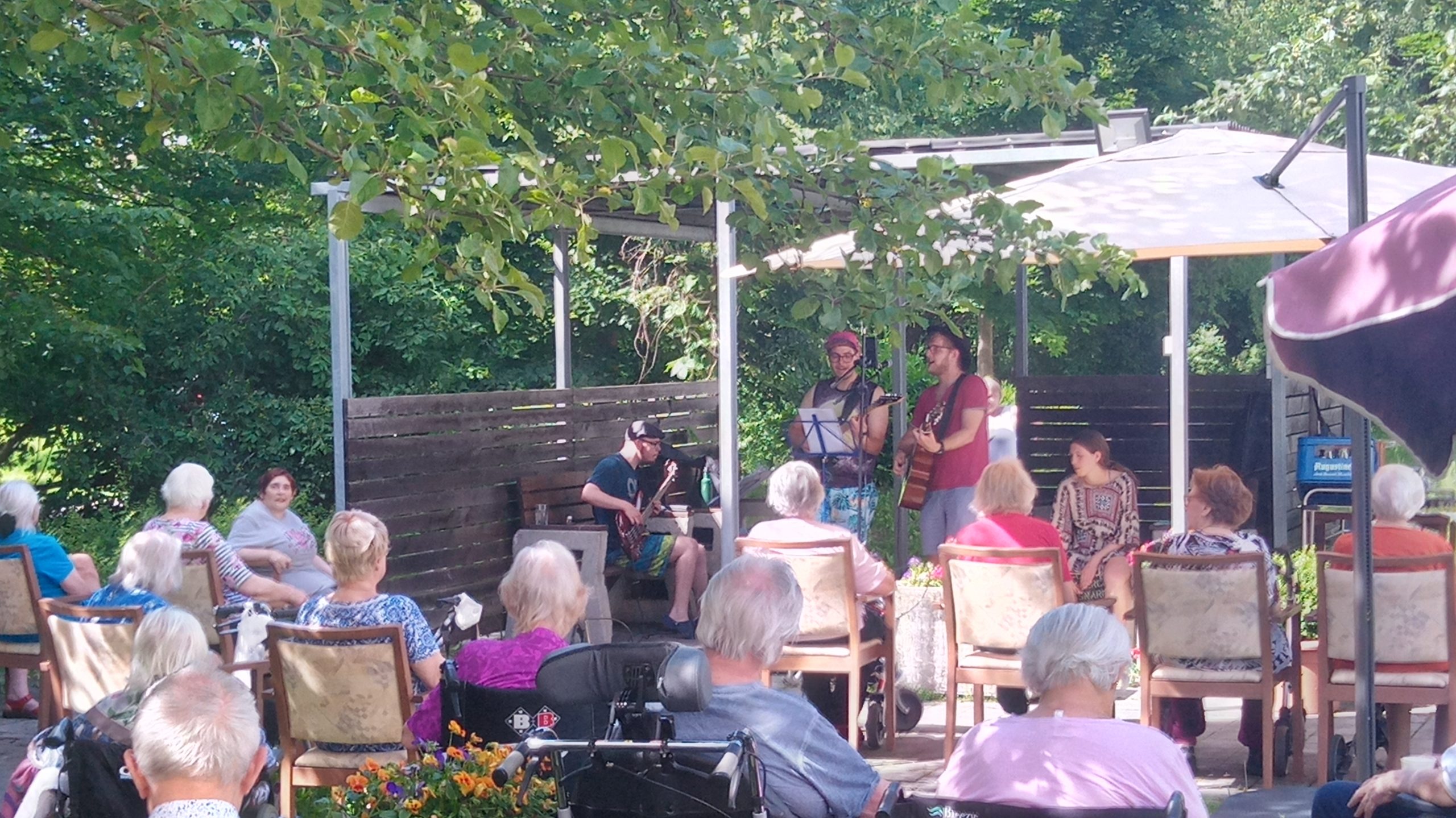 Diesmal war er mit Ole Berg (E-Bass), Severin Beger (E-Gitarre) und Hanna Hufnagel (Cajon) im lauschigen Garten des Arbeiter Samariter Bundes in Neuried. Bei schönstem Sommerwetter und super Bewirtung durch die Damen des Hauses machten die Vier auch dieses Mal riesigen Spaß mit ihren eingängigen Songs und steckten die Bewohner*innen mit ihrer guten Laune an!
