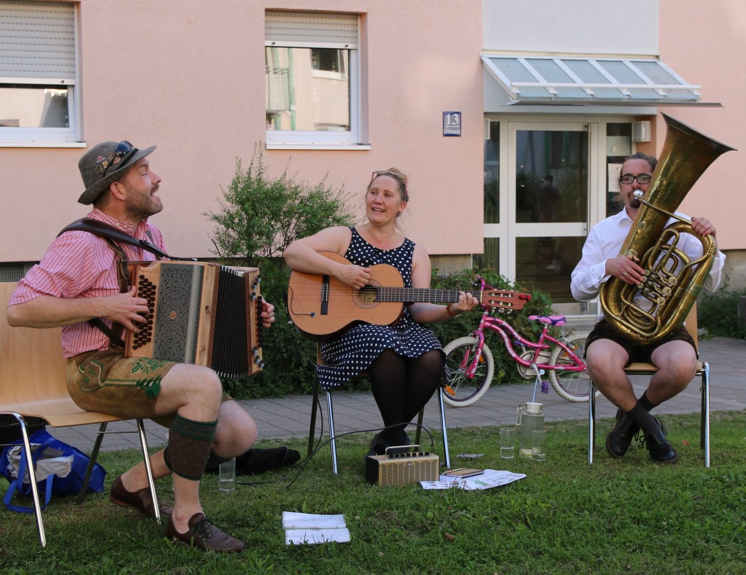 Susanne Achatz (Gitarre) und ihre beiden „Buabn“ Klaus Altenbuchner (Akkordeon) und Martin Achatz (Tuba) haben mit zünftiger Musik toll eingeheizt, viele Bewohner*innen der Anlage haben im Garten und auf den Balkonen teilgenommen und das Wetter war wie aus dem Bilderbuch.