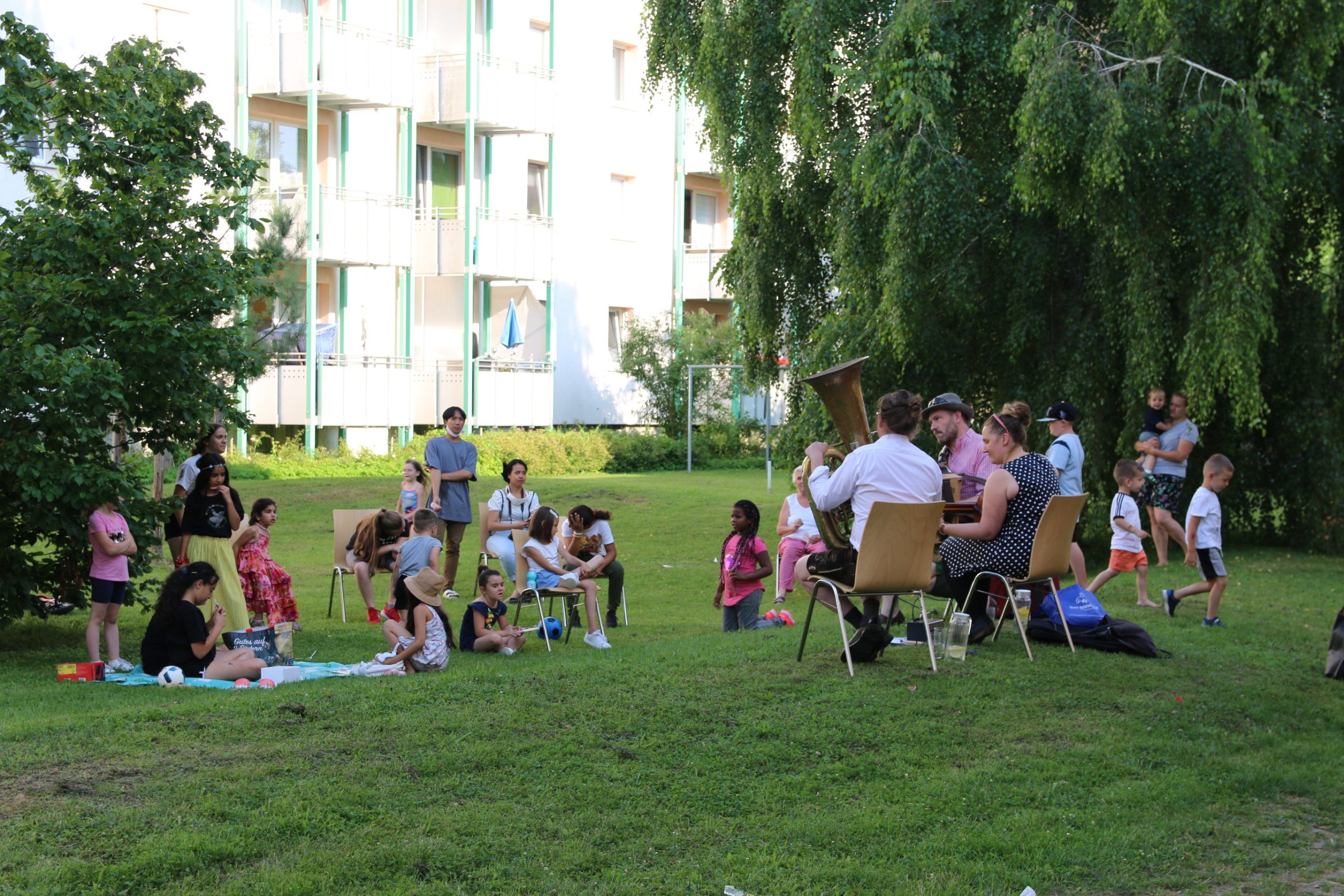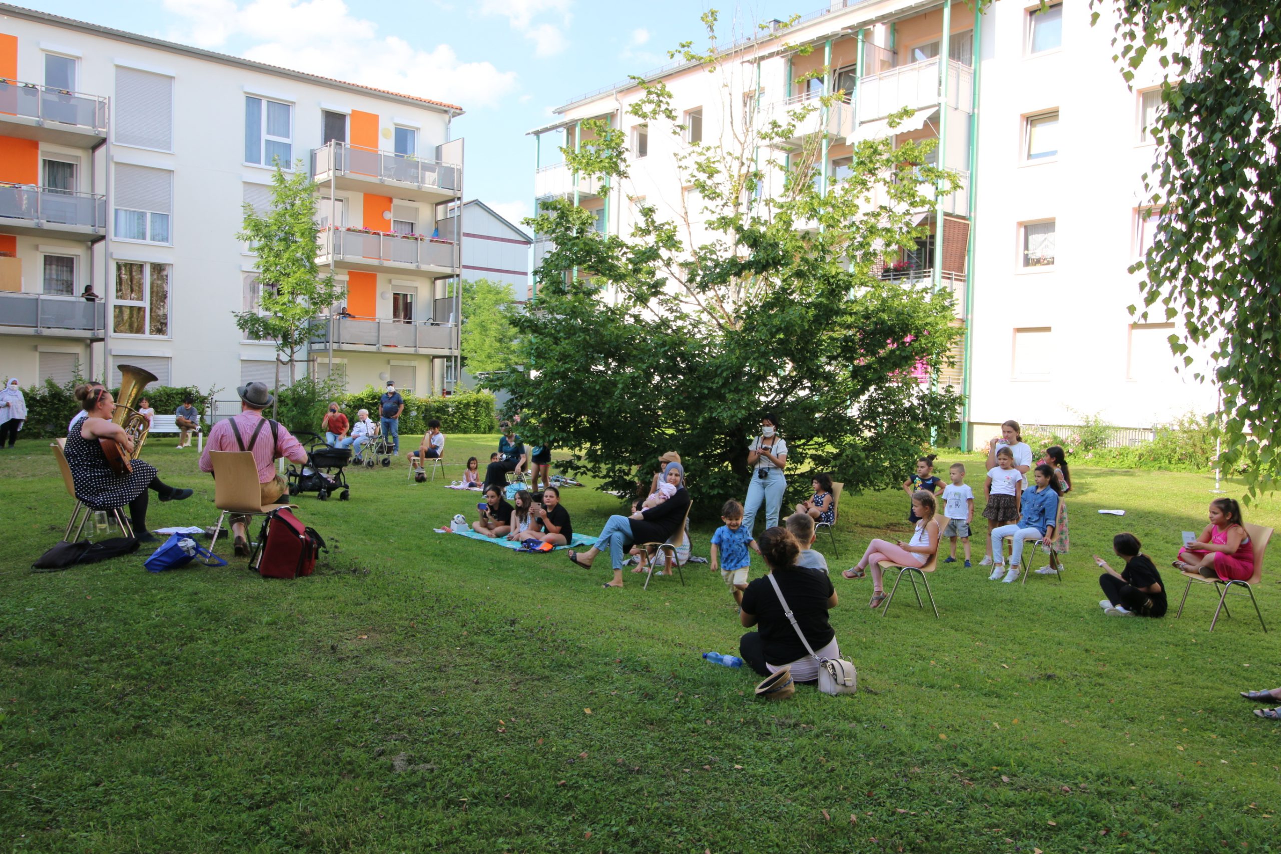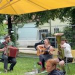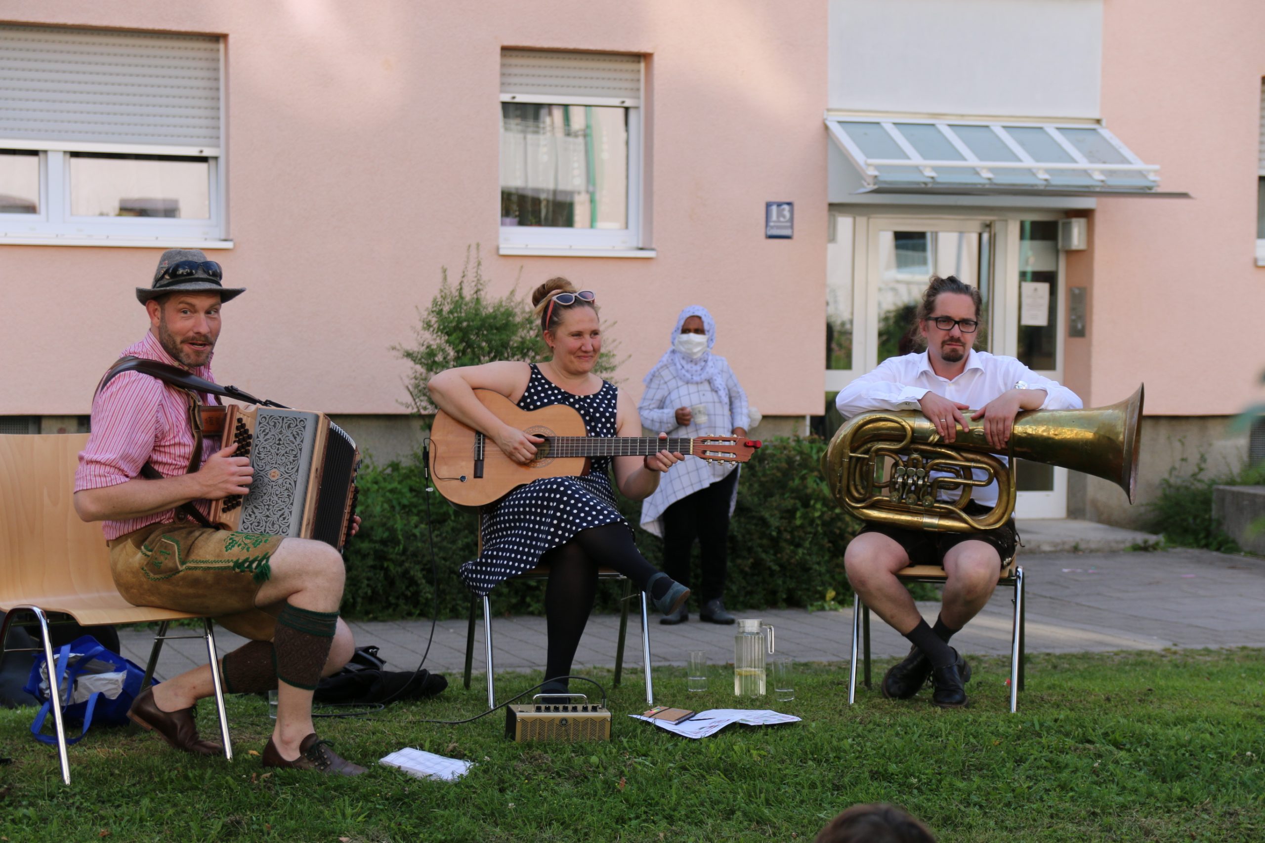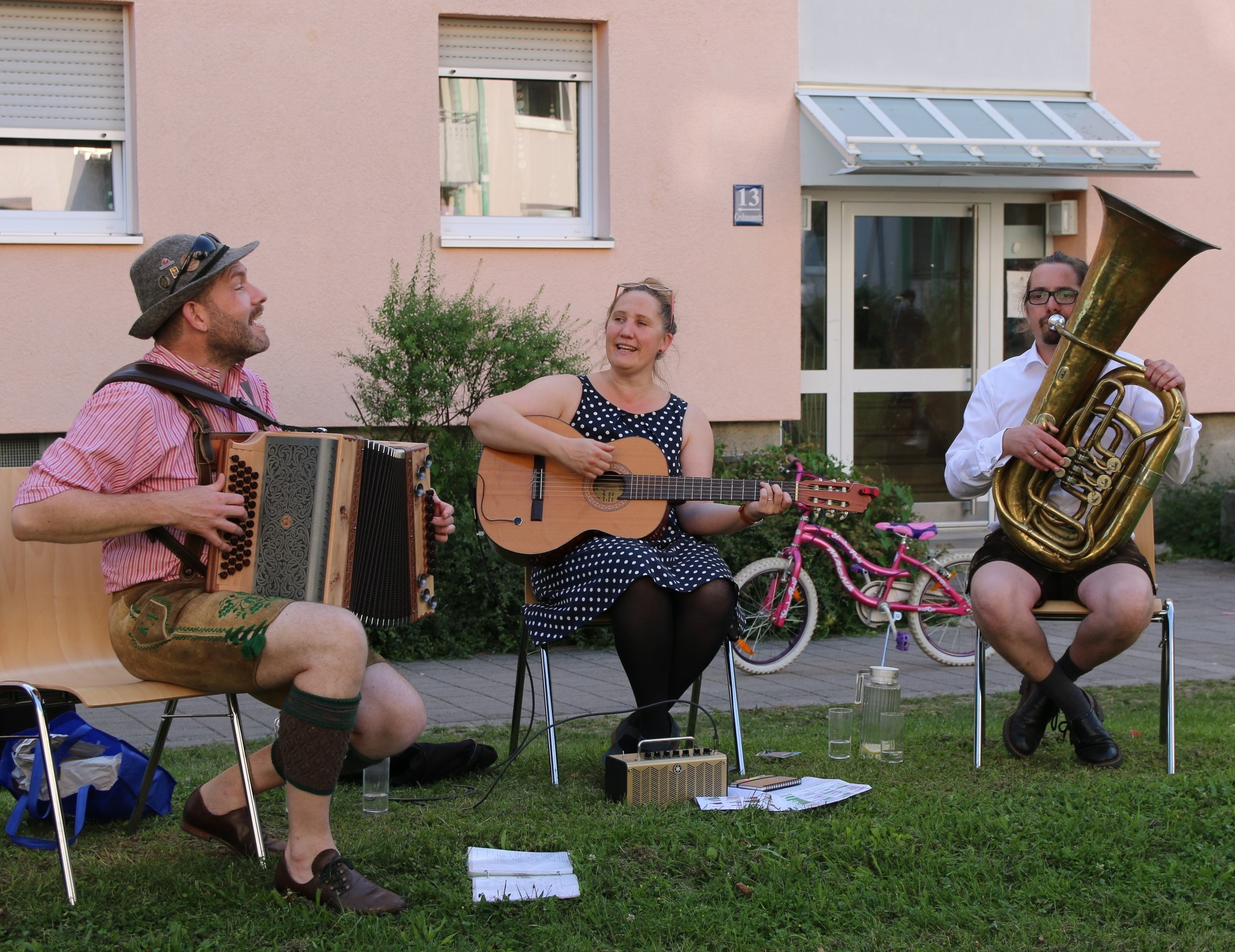 Susanne Achatz (Gitarre) und ihre beiden „Buabn“ Klaus Altenbuchner (Akkordeon) und Martin Achatz (Tuba) haben mit zünftiger Musik toll eingeheizt, viele Bewohner*innen der Anlage haben im Garten und auf den Balkonen teilgenommen und das Wetter war wie aus dem Bilderbuch.