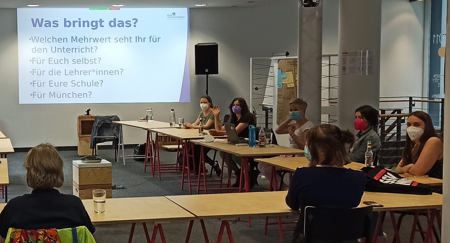 Besonderes Highlight: unsere hybride Veranstaltung fand im nagelneuen Münchener Haus der Schüler*innen statt, das seit kurzem als Versammlungsort, Ideen- Hub und Workshopschauplatz für die Schüler*innen der Stadt bereitsteht.