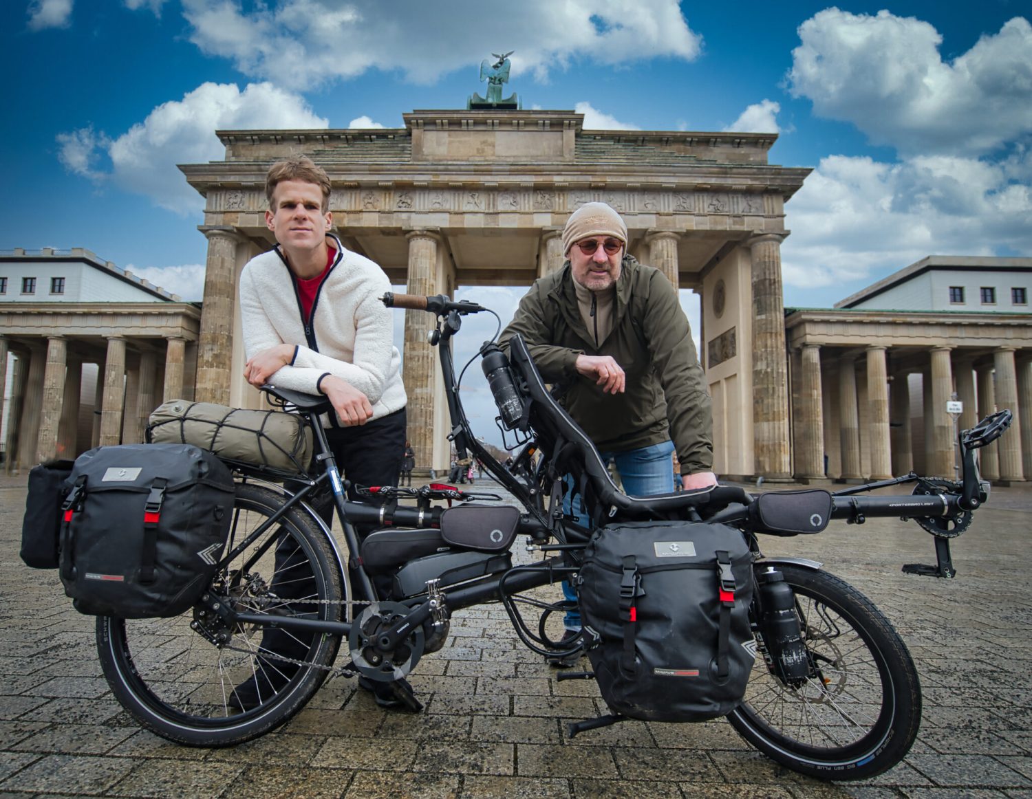 Mit einem Fahrrad fahren Sebastian und Sven quer durch Deutschland.