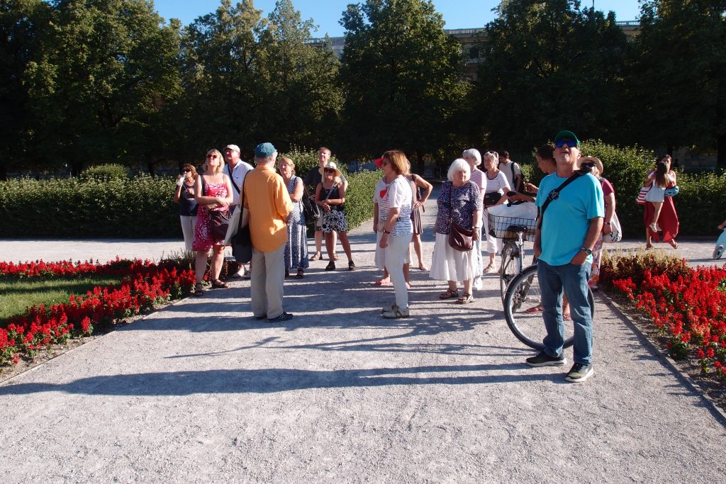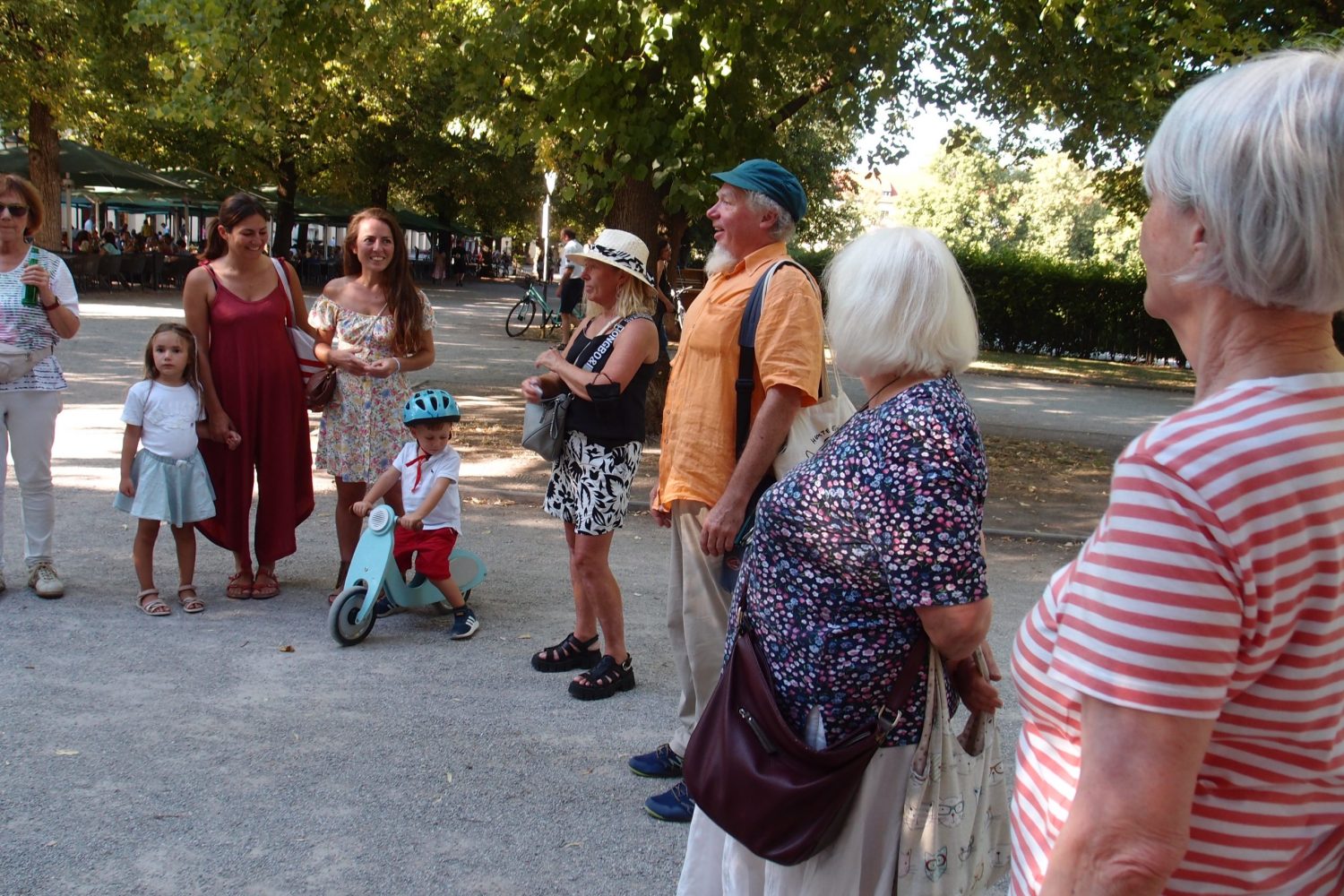 Beim Treffpunkt war es so heiß, dass alle Teilnehmenden ums Eck im Schatten warten durften. Der Stadtführer nicht, aber der ist’s gewohnt. Das hat gut funktioniert und alle habens gefunden, trotz einem Stillstand in den Öffentlichen
