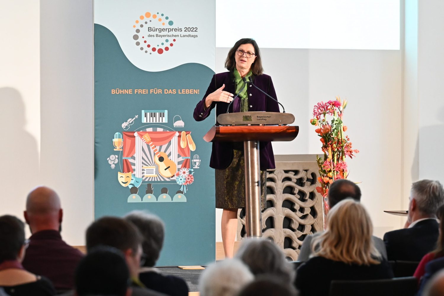Vier ehrenamtliche Projekte wurden im Senatssaal des Bayerischen Landtags geehrt. Die Preisträgerinnen und Preisträger bringen in besonderer Weise durch ehrenamtliches Engagement Menschen im Freistaat durch Kunst und Kultur zusammen, denn das Leitthema war „Bühne frei für das Leben! Ehrenamtliches Engagement für gesellschaftliches Miteinander durch Kunst und Kultur“.