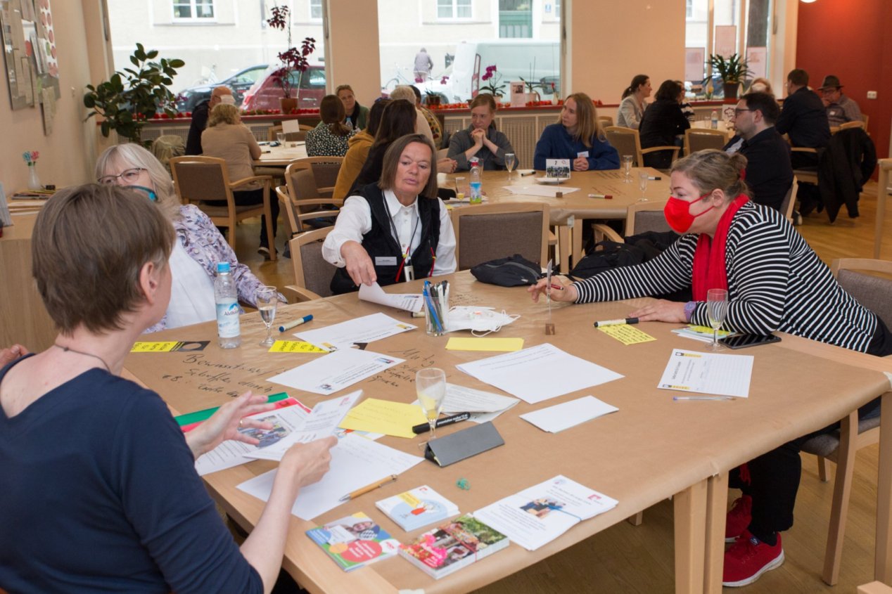 Nach jeweils 15 Minuten hatten die Teilnehmer*innen die Gelegenheit, den Tisch und das Thema zu wechseln. Zum Abschluss präsentierten die Moderatorinnen die Ergebnisse.
