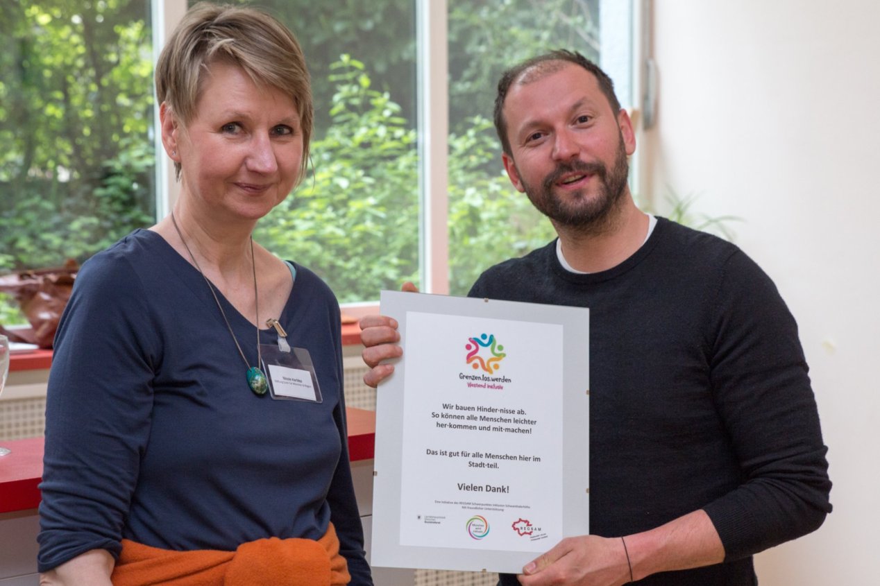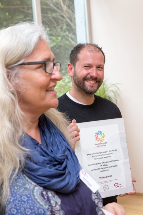 Diese Auszeichnung würdigt, dass sich die Einrichtung für eine barrierefreie Nutzung ihrer Räume und Angebote engagiert. Damit fördert sie Inklusion im Alltag, von der alle Menschen im Stadtteil profitieren.