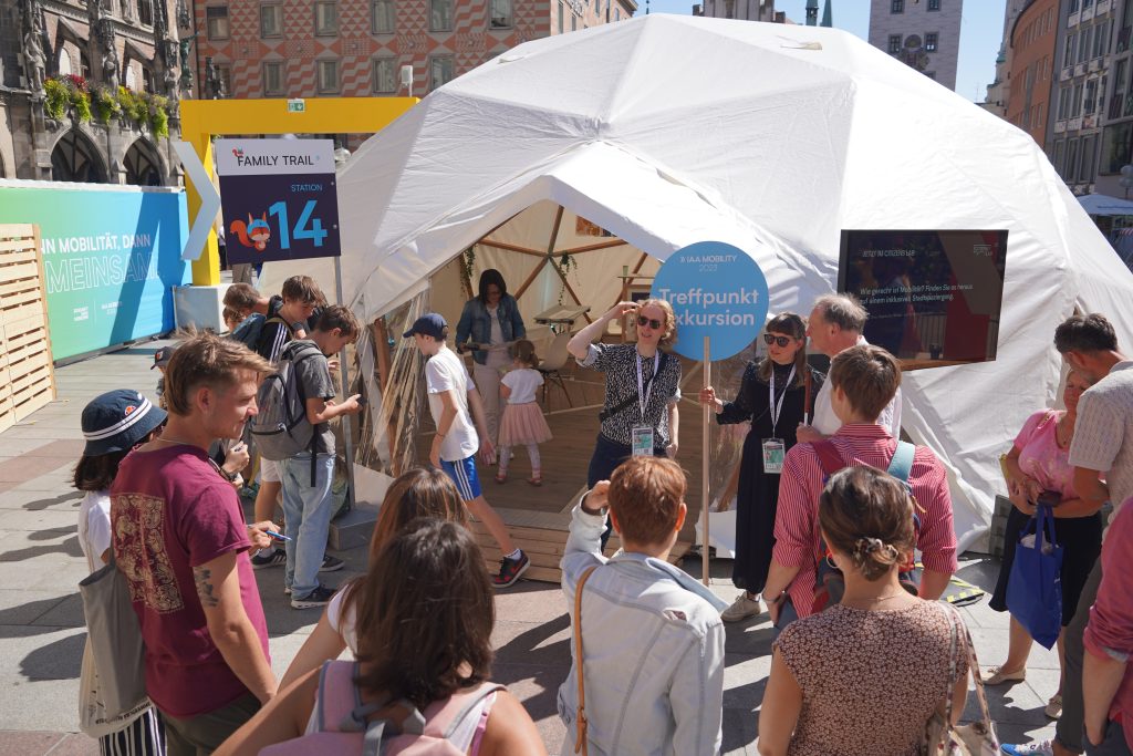 Der Rundgang fand statt mit Andreas Scherer von der Stiftung Pfennigparade, der selbst im Rollstuhl sitzt und der Gruppe wertvolle Hinweise im Umgang mit (E-) Rollstühlen gab. Im Anschluss füllten alle Teilnehmer noch einen Fragebogen zur inklusiven Mobilität des Lehrstuhls für Siedlungsstruktur und Verkehrsplanung der TU München aus.