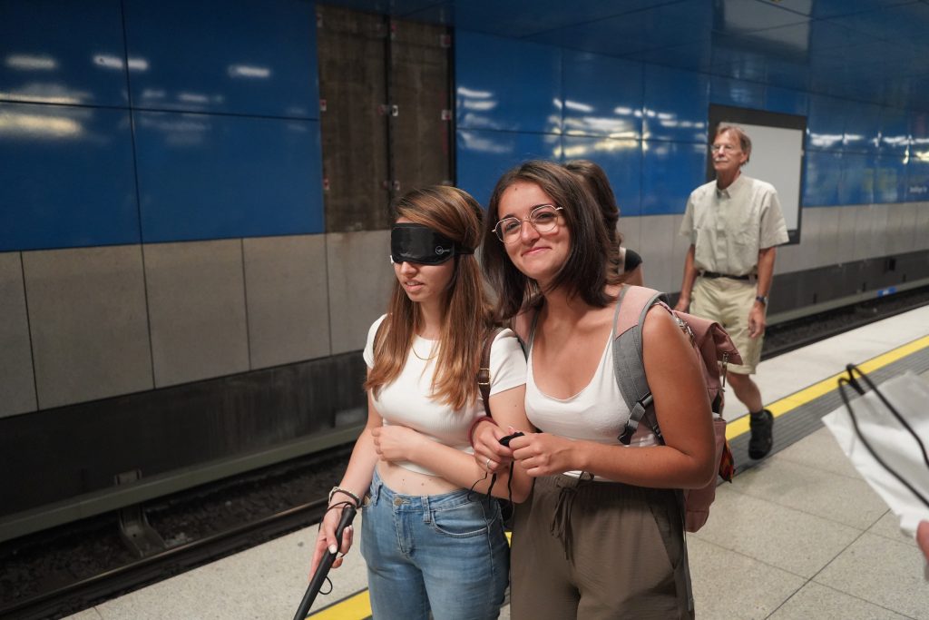 Unsere Mission war klar: Vom Marienplatz mit der U-Bahn zum Sendlinger Tor fahren. Eine kurze, alltägliche Strecke wurde zu einer intensiven Lernerfahrung. Taktile Führungssysteme und insbesondere die menschliche Hilfe erhielten eine neue Bedeutung. Früher fast unbemerkt, erlebte ich die Relevanz dieser Elemente in der Dunkelheit, die uns umgab.