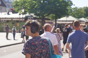Einen Tag später, nach dem Glockenspiel am Marienplatz, trafen wir uns erneut. Die Herausforderung des Tages bestand darin, die Stadt aus der Perspektive eines Gehörlosen zu erleben. Mit Ohrenstöpseln und Kopfhörern ausgestattet, setzten wir unseren Spaziergang fort.