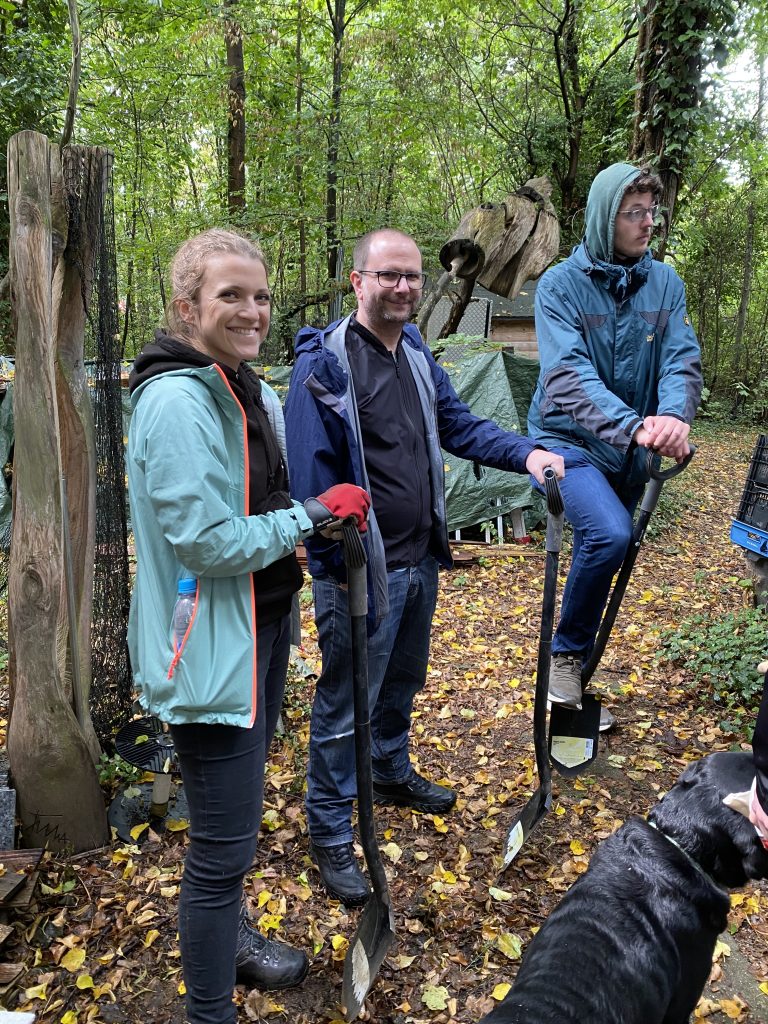 Anschließend begannen die Arbeiten für den Tag, bei denen das Aufräumen im Mittelpunkt stand. Zunächst musste ein großer Erdhügel abgetragen und mit Schubkarren an eine andere Stelle umgeschichtet werden, um auf dem Gelände für Ordnung zu sorgen. Parallel dazu wurde eine große Tonne mit Erde und Pflanzen entleert, da diese durch Vandalismus zerstört worden war und daher entsorgt werden sollte. Trotz des wechselhaften Wetters und der regelmäßigen Regenschauer arbeitete das Team mit voller Motivation und Einsatzfreude.