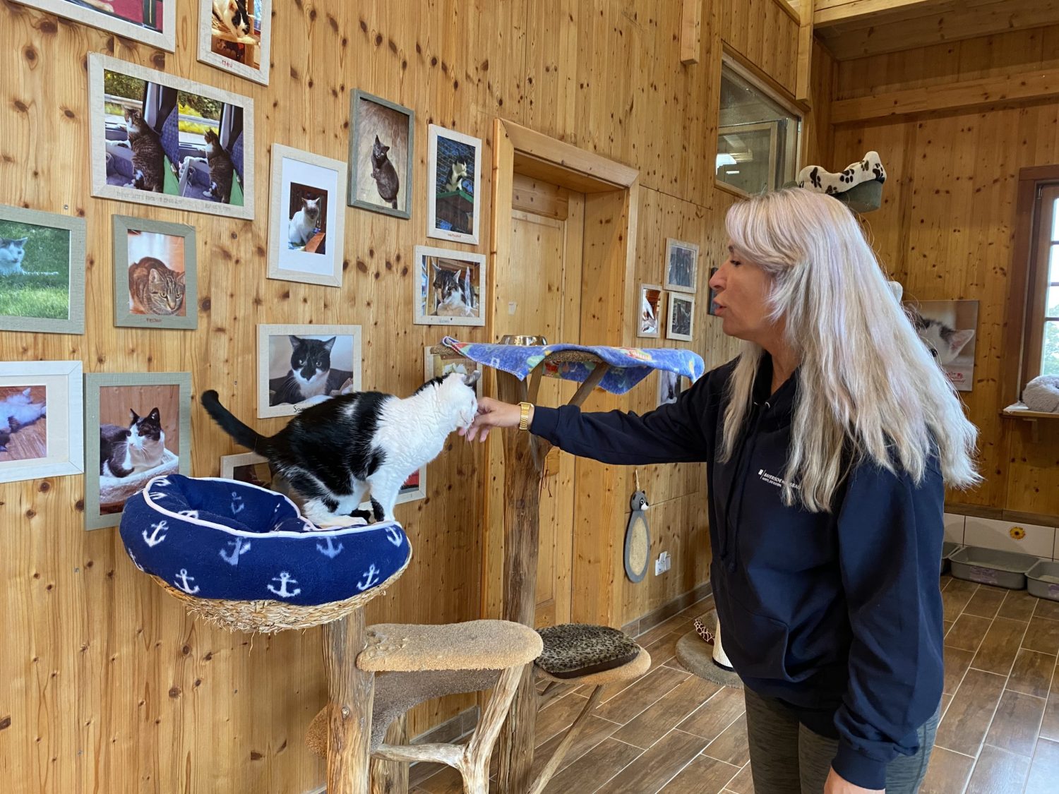 Die Katzen leben auf Gut Aiderbichl in einem großen Indoor-Bereich, der über ein geschlossenes Außengelände verfügt, das die Tiere jederzeit über einen Tunnel erreichen können. Zunächst wurden die Katzen liebevoll gestreichelt, bevor es an die weniger angenehme Aufgabe der Reinigung der Katzenklos ging. Um sicherzustellen, dass die Tiere optimal versorgt werden, fuhr eine Mitarbeiterin sogar zu einem Tierfachgeschäft um frisches Katzenstreu zu besorgen. Eine Mitarbeiterin meldete sich freiwillig, in den engen Tunnel zu klettern, der das Katzenzimmer mit dem großen Außengehege der Samtpfoten verbindet, um auch diesen gründlich zu reinigen.