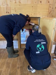 Eine weitere Gruppe engagierte sich bei der Reinigung des Hühnerstalls, während eine andere Gruppe damit beauftragt war, die Ziegen von der Koppel in den Stall zu treiben und Futtersäcke mit Heu zu befüllen. Überall auf dem Gut wurde fleißig ausgemistet, und die Mitarbeiter*innen unterstützten die Tierpfleger*innen in ihrer wichtigen Arbeit.
