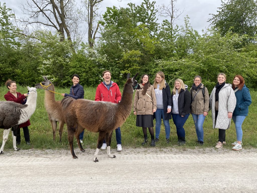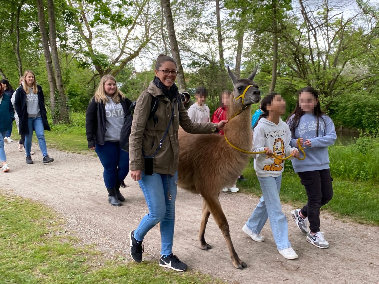 Nadine Hetzer von LamaGlück, die mit ihren drei Lamas extra aus dem benachbarten Ismaning angereist war, sorgte nicht nur für die Sicherheit und das Wohl der Tiere, sondern konnte den Teilnehmer*innen auch allerlei wissenswerte Informationen über Lamas weitergeben.