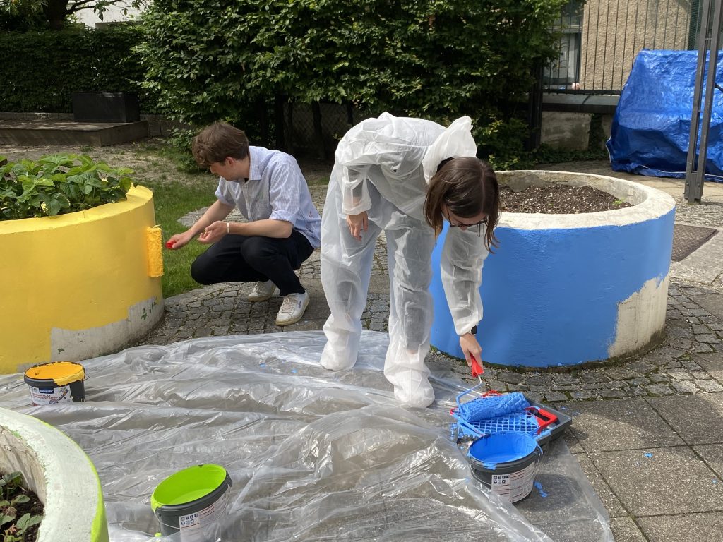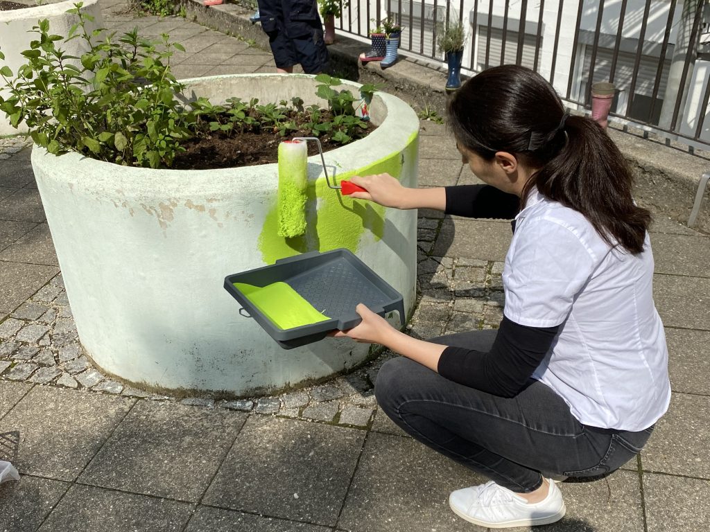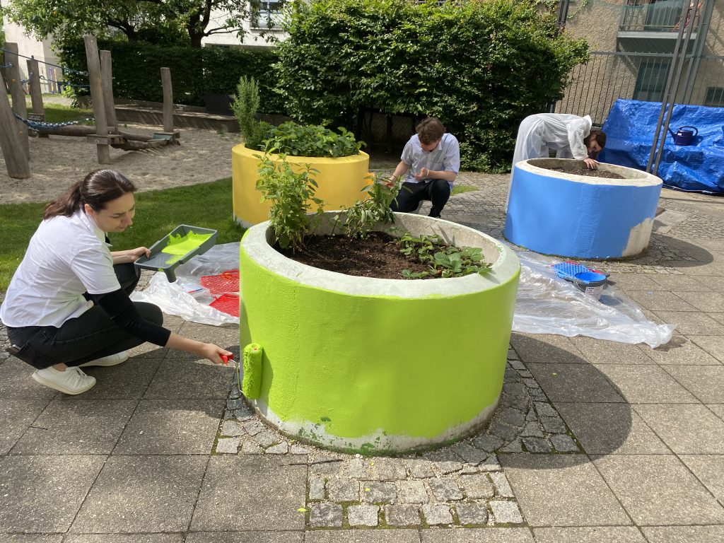 Ein zweiter Teil kümmerte sich um die Hochbeete. Die Betonröhren, die für die Kinder zu Hochbeeten umfunktioniert wurden, sahen bislang im tristen Betongrau wenig kinderfreundlich aus. Auch hier wurden wieder die Gruppen-Farben aufgegriffen. Während die Mitarbeiter*innen mit dem streichen beschäftigt waren, lugten schon die ersten Kinderköpfe aus den Fenstern und ein freudiger „Oh, eins wird gelb!“-Ruf, hallte durch den Garten.