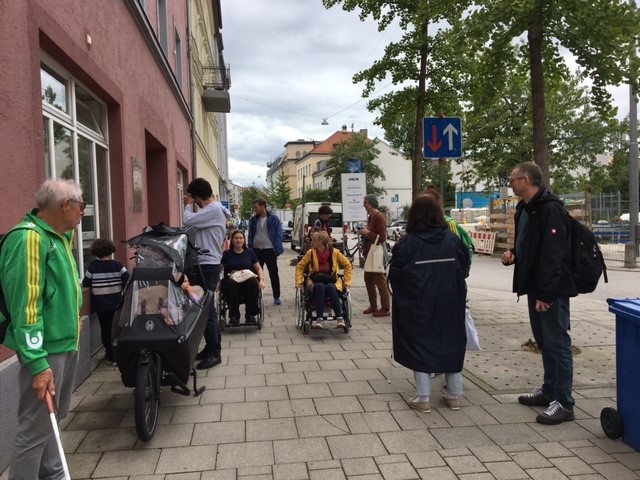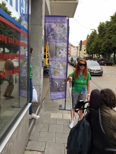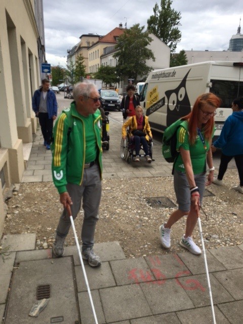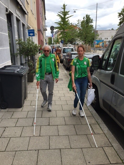 Ausgerüstet mit Spezialbrillen, die in verschiedenen Schwierigkeitsgraden unscharfe Sicht, Sehbehinderungen bzw. Blindheit simulieren und mit einem weißen Blinden-Langstock gingen einige der 10 Teilnehmer durchs Westend und überquerten Straßen wie die Schwanthaler Straße mit starkem Verkehrsaufkommen.