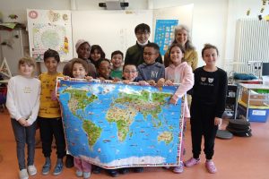 Besuch aus Japan bei den Isarbienchen. Die Kinder der LdE- Klasse von Verena Böhl staunten nicht schlecht, als Herr Fuji erzählte, dass die Kinder in Japan 800 verschiedene Schriftzeichen lernen müssen. Der stellvertretende Direktor des Zentrums für Lehrpläne von der Nihon Fukushi Universität interessiert sich sehr für „Lernen durch Engagement“ und möchte das Format gerne