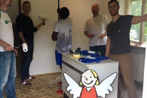 Bei ihrem sozialen Engagement haben Mitarbeiter von Paribas mit viel Elan in einer dezentralen Flüchtlingsunterkunft die Küche renoviert. Auch Dr. Jürgen Eikenbusch von BNP Paribas Deutschland (2. von links im Bild) und ein Hausbewohner legten am Freitag, 29. Juni, mit Hand an. Der Engel von Gute-Tat freute sich über insgesamt 40 fleißige BNP Firmenmitarbeiter in